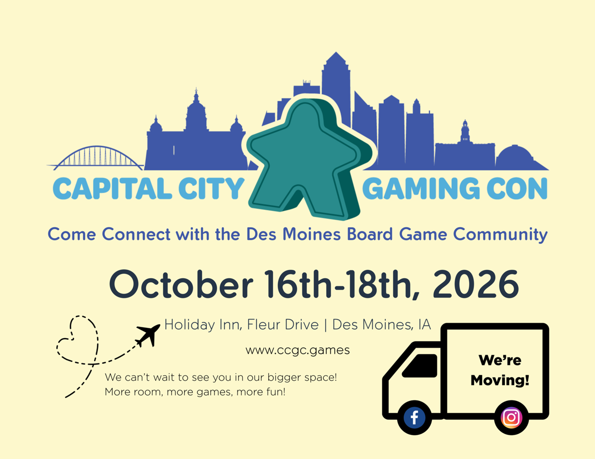 Capital City Gaming Con is the Des Moines area board gaming convention. It is a weekend full of fun and games held annually.